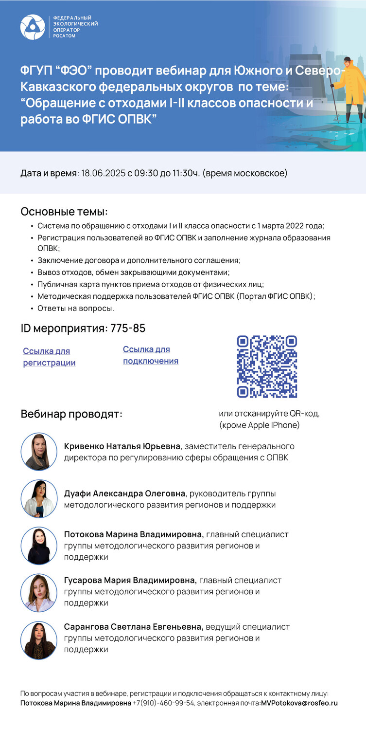 Во исполнение пункта 2 плана мероприятий и в целях методологической поддержки участников отрасли обращения с отходами I и II классов опасности (далее – ОПВК) запланировано проведение обучающего вебинара для юридических лиц и индивидуальных предпринимателей, в том числе органов местного самоуправления, управляющих компаний, организующих пункты приема (места накопления) ОПВК от физических лиц, осуществляющих деятельность на территории Южного федерального округа.